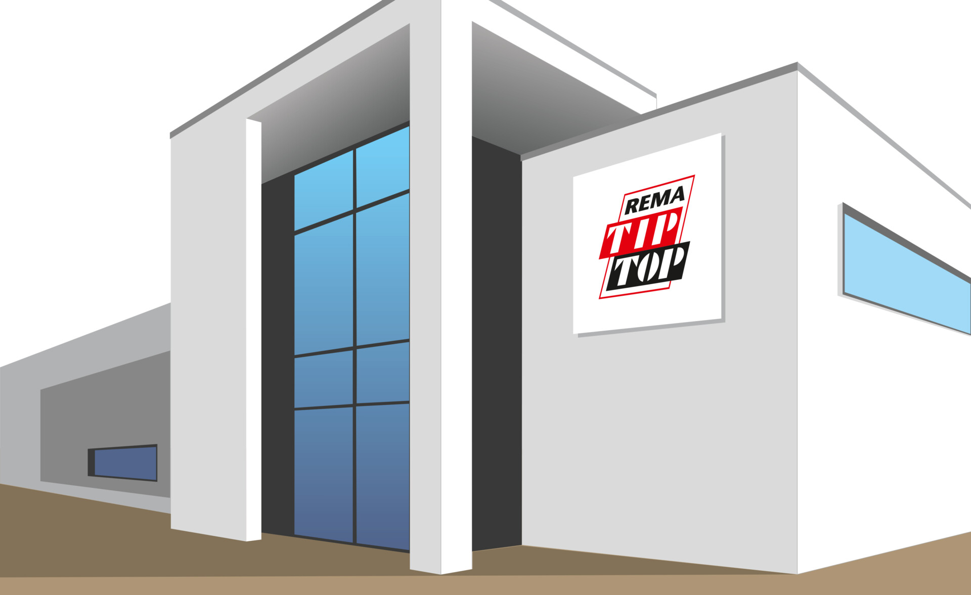 REMA TIP TOP buildings should be designed predominantly in white. This also applies to doors, windows, and other structural elements. As an exception, doors may also be finished in REMA TIP TOP red. If the facade color must deviate from white, the logo must be placed on sufficiently large white background areas.