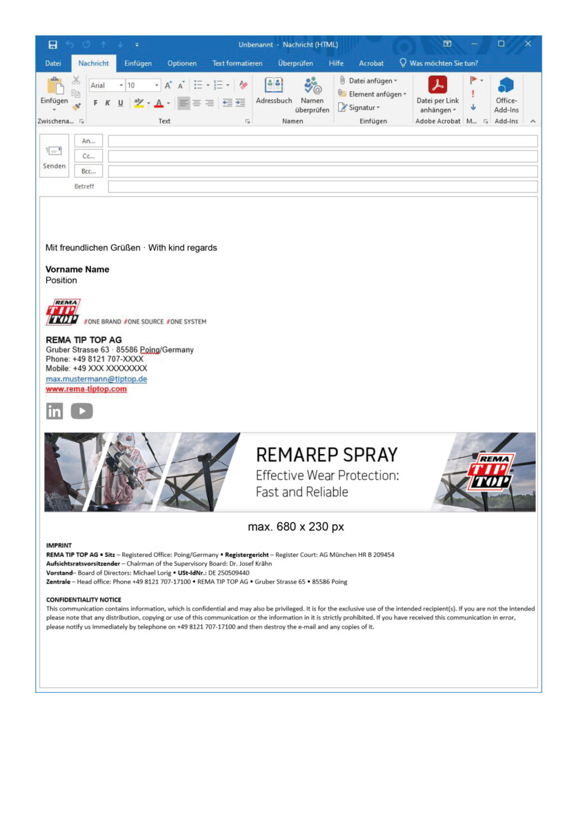 If trade fair banners or other promotional banners are included in email signatures, they must always be placed below the social media icons and above the imprint.